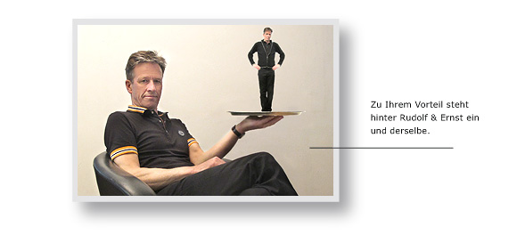 Nicht so bei uns. Wir signalisieren über unserer Identität zwar bewusst Werbung als Resultat all seiner Fachdisziplinen (weil die Qualität vom Resultat, dem einer klassischen Werbeagentur in nichts nachsteht): Rudolf & Ernst ist aber keineswegs «der Eine» oder «Andere», sondern untrennbare Einheit – Rudolf ist Ernst und Ernst ist Rudolf.